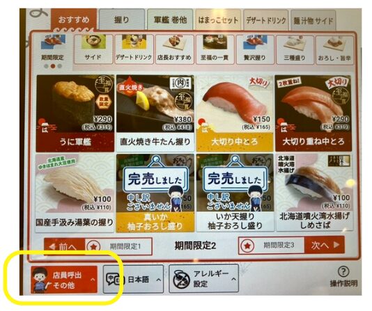 申請は、「レジスタッフ」や「座席のタッチパネル」の左下から店員を呼び出して、直接シニアパスを希望する旨を伝えるとOKです。
