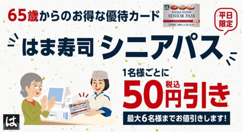 はま寿司のシニアパスは、会計時にカードを提示するだけで1人あたり50円引きになるシンプルでわかりやすい割引サービスです。