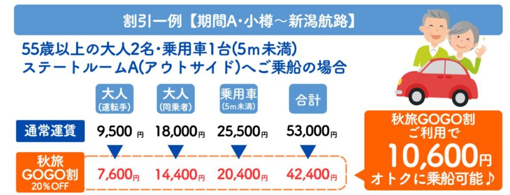 新日本海フェリー | 〇 あり | GOGO割 「秋旅GOGO割」 「夏旅GOGO割」など 20%OFF | 55歳以上 | 公式サイトでネット予約もしくは電話予約 旅行会社でも可能 |