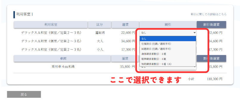 そして、利用人数、乗用車の大きさ、日付・人数・車両の有無を入力するだけで、該当日の通常運賃や割引後の金額が自動で表示されます。